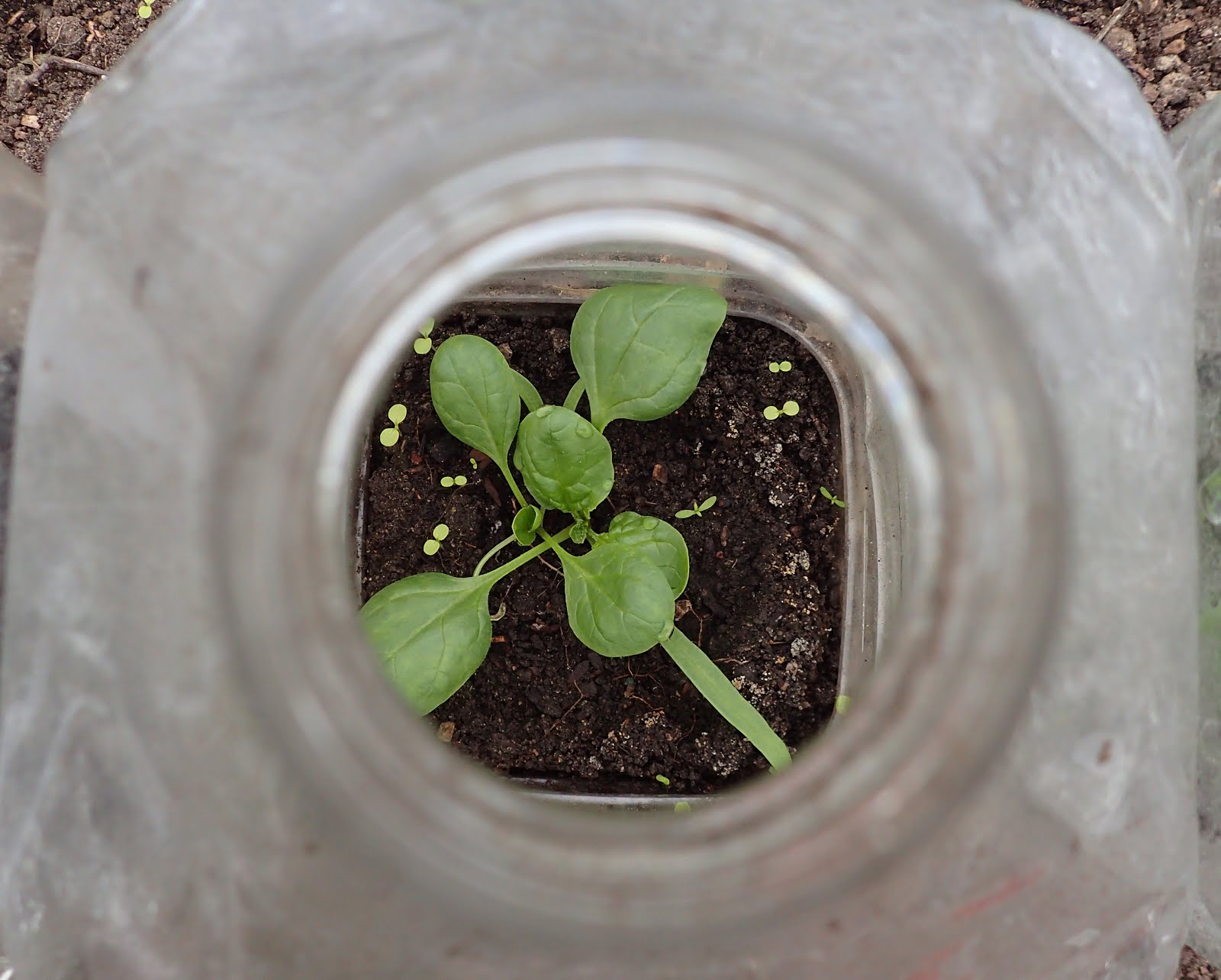 I set out seedlings of Batavia broccoli where the snap beans had been growing. My experiments with starting broccoli under water bottle cloches worked so well last winter that I'm continuing the experiment this winter. The seeds were sown together in 4-inch pots and then I separated the seedlings and set them out in the garden under the cloches. I used to pot them up into individual quart sized pots before putting them into the garden, but my new method saves the hassle of tending to the potted plants. The only time I'll do the potting up from now on is if there isn't room in the garden for the seedlings when they need to be potted up or planted out. And look at those I'itoi onions - they're so happy!